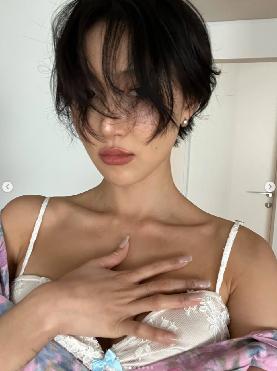 드레스 위에 더해진 란제리 디테일과 짧은 단발, 내추럴 메이크업까지 어우러져 특유의 고혹적인 분위기를 완성했더라고요.