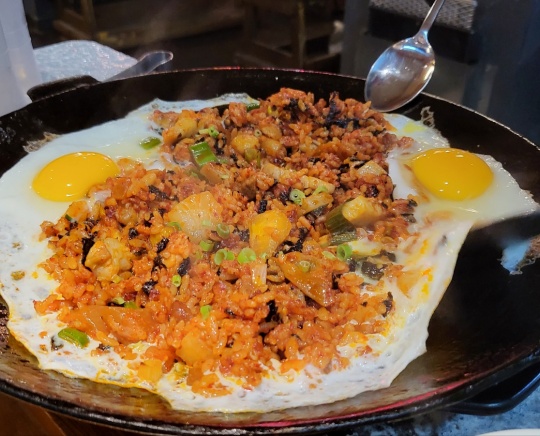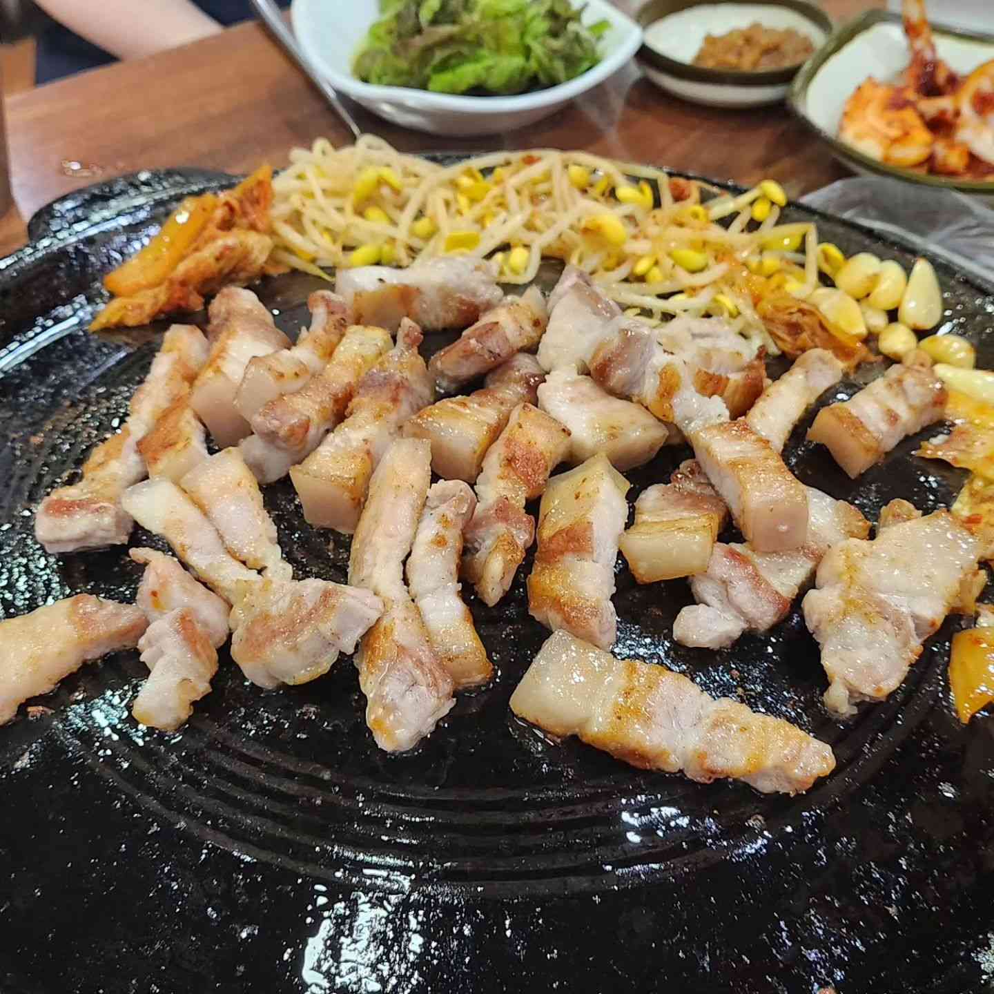 해발 500미터 고지대에서 자란 흑돼지는 지리산 산청의 특산물로 유명하다. 단단한 육질과 풍부한 육질로 유명한 산청흑돼지는 입 안에서 터질 듯 뿜어져 나오는 촉촉한 육즙과 혀끝까지 고소한 맛이 좋은 곳이다. 눈이 휘둥그레해질 정도로 맛있는 산청흑돼지는 신선한 고기만을 취급해 냉동 고기를 사용하지 않는다. 무쇠로 만든 가마솥 뚜껑에 지글지글 구워낸 고기는 살점이 고소하면서 껍데기의 식감이 살아있는 게 특징이다. 1년간 숙성시켜 나오는 김치찌개 또한 일품이다.