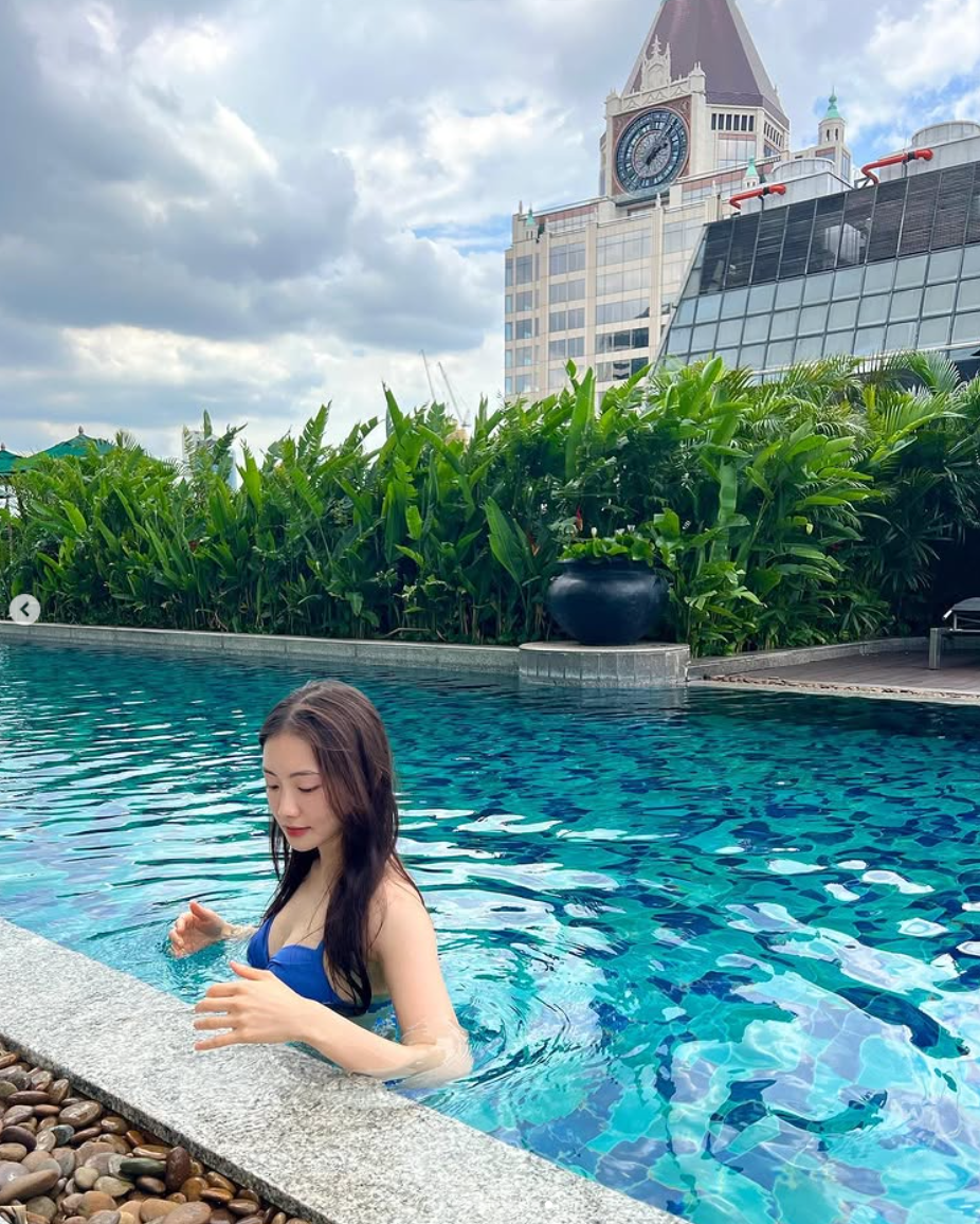 도심 속 루프톱 수영장, 상상만 해도 근사하잖아요. 그녀는 이곳에서 블랙 모노키니를 입고 등장했는데, 정말 시크함의 끝판왕이었어요.