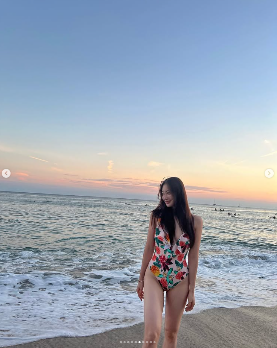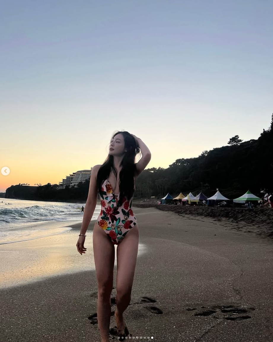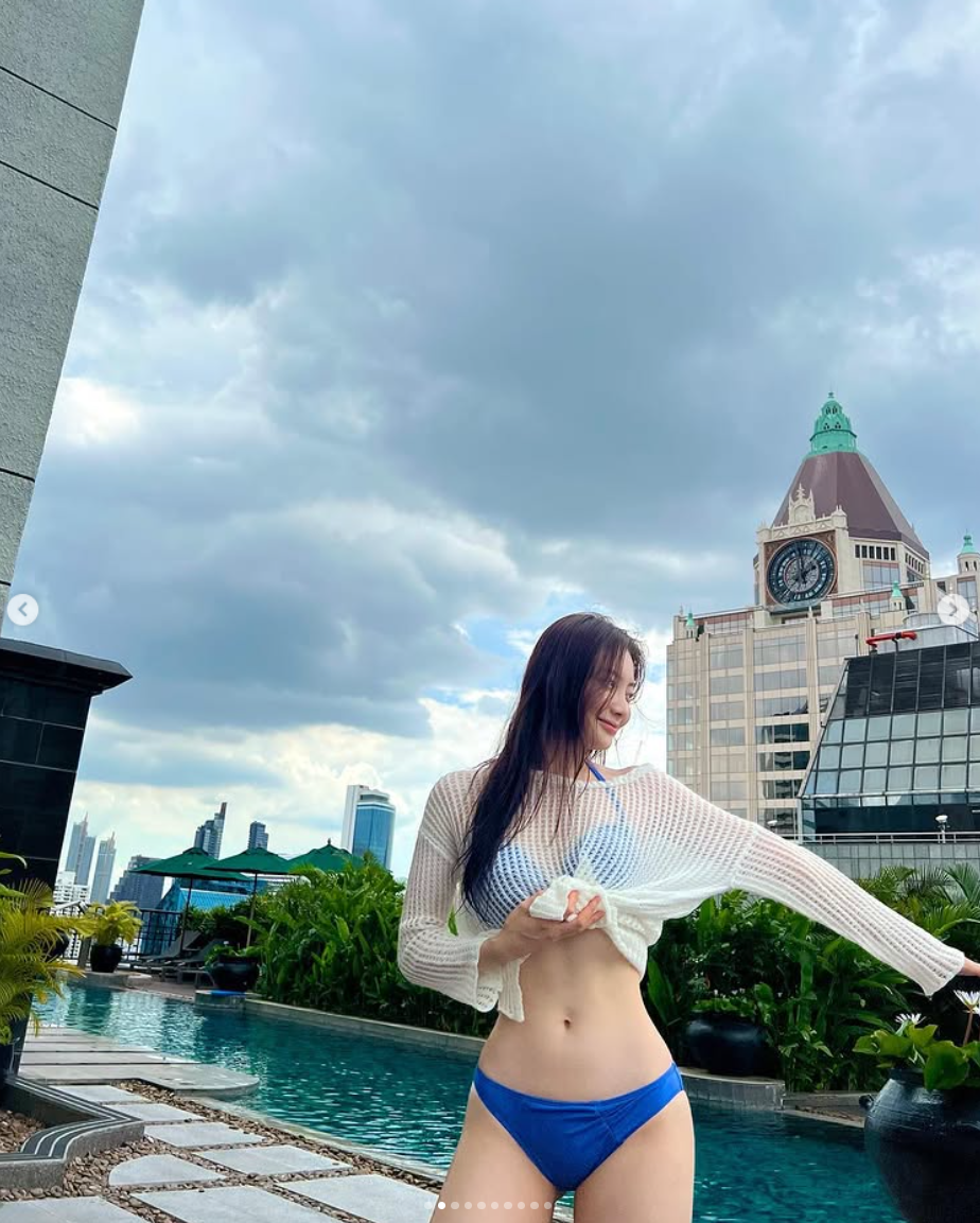 이번엔 블루 컬러 비키니에 니트 커버를 매치해서 또 다른 분위기를 연출했어요. 상체 라인을 자연스럽게 드러내면서도 균형 잡힌 비율이 정말 예쁘게 담겼더라고요.