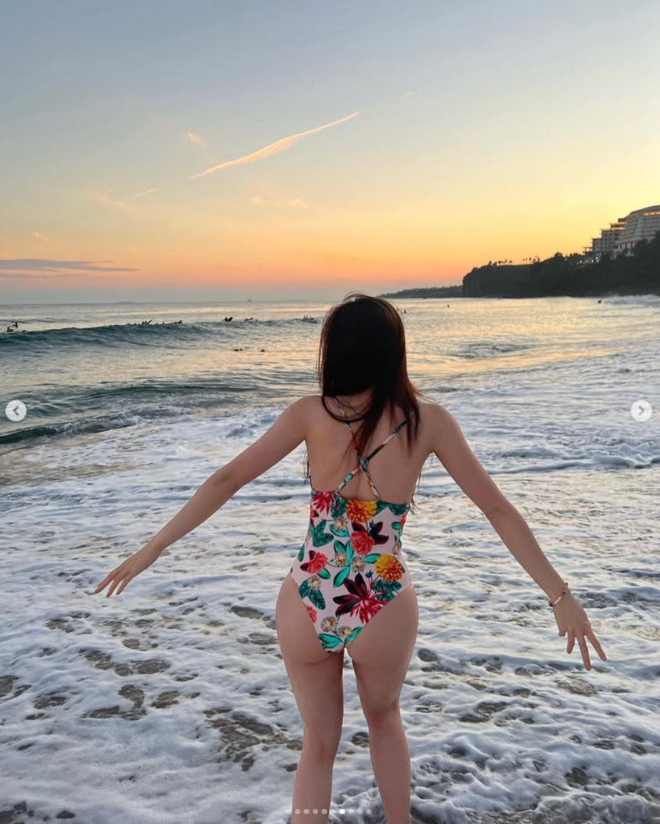 마지막은 노을 지는 해변을 배경으로 한 장면이었는데, 여기서는 플라워 패턴 원피스 비키니를 선택했어요. 루프톱이나 도심 수영장과는 또 다르게 차분하면서도 감성적인 분위기가 확 느껴지더라고요.