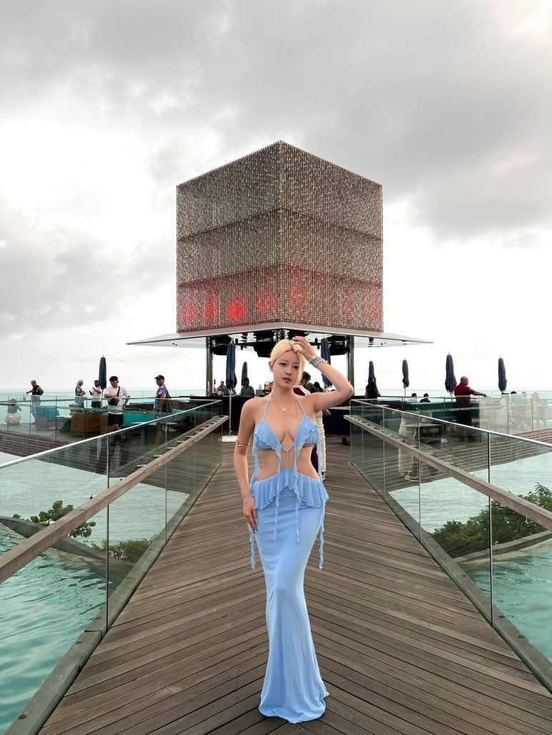 패션 포인트: 연한 파란색(스카이 블루)의 러플 디테일 컷아웃 드레스를 선택했어요. 홀터넥 스타일로 상반신을 시원하게 드러내면서도, 허리 부분의 컷아웃이 슬림한 라인을 강조해 섹시함을 더하죠. 바닥에 닿는 롱 드레스 기장이 우아한 무드를 완성합니다. 👗