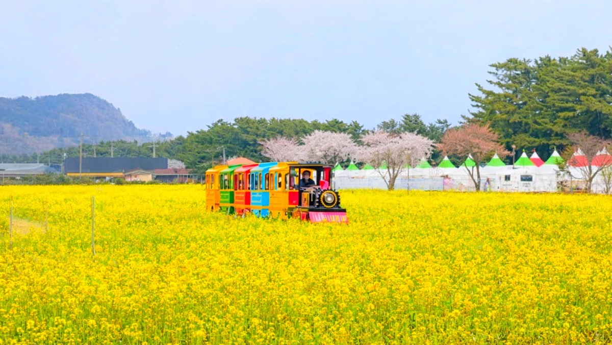 노란 기차 길이나 원두막 포토존 등에서 만개한 유채꽃을 만날 수 있다. 꽃밭 사이를 가로지르는 미니열차 선로 주변은 동화 같은 분위기를 연출한다. 꽃밭 중간중간 설치된 원두막은 높은 곳에서 꽃밭을 내려다보는 구도를 만들어준다. 꽃에 파묻힌 모습보다 꽃밭 전체의 풍성함을 담기에 좋다.