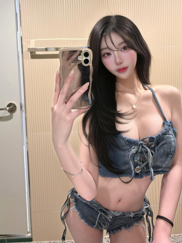 두 번째 사진은 거울 셀카의 정석! 빈티지 워싱이 매력적인 데님 코르셋 톱과 숏팬츠 셋업이에요. 💙