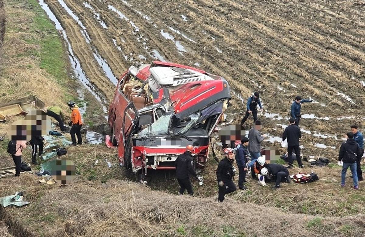 연합뉴스에 따르면 소방 당국은 주행 중이던 버스가 승용차와 한차례 부딪힌 뒤 가드레일까지 들이받고, 그대로 도로 아래 논으로 추락하면서 전도된 것으로 보고 있다.