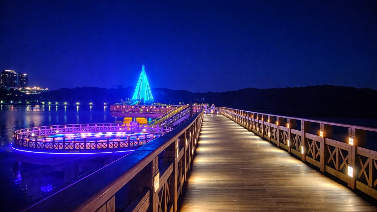 호수의 백미는 단연 호수를 가로지르는 370m 길이의 보행교다. 길이 370m, 너비 3m의 대형 나무 데크 다리로, 위에서 내려다보면 전체적인 형상이 용의 모습을 띠고 있다. 다리 난간과 바닥에는 수천 개의 LED 조명이 설치돼 있어 밤이면 화려한 조명이 낭만적인 분위기를 자아낸다. 특히 다리 중간중간에 투명 유리 바닥 구간과 하트 모양의 포토존이 마련돼 있어 데이트 코스로도 인기가 높다.