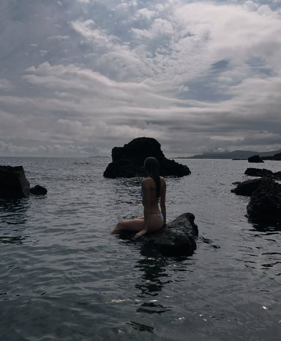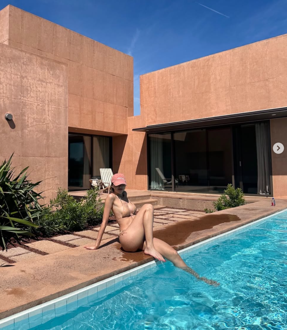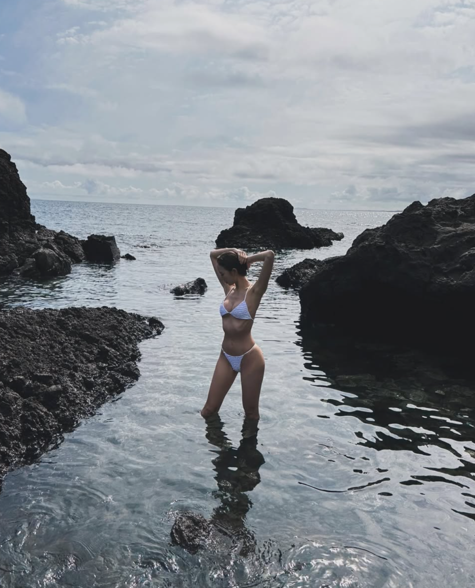 특히 그가 착용한 비키니는 샌드 베이지 컬러를 베이스로 화이트 물방울 패턴이 가미된 디자인인데요. 과하지 않은 절제된 패턴이 세련되고 감각적인 인상을 주면서 해변의 자연 풍경과도 자연스럽게 어우러져요.