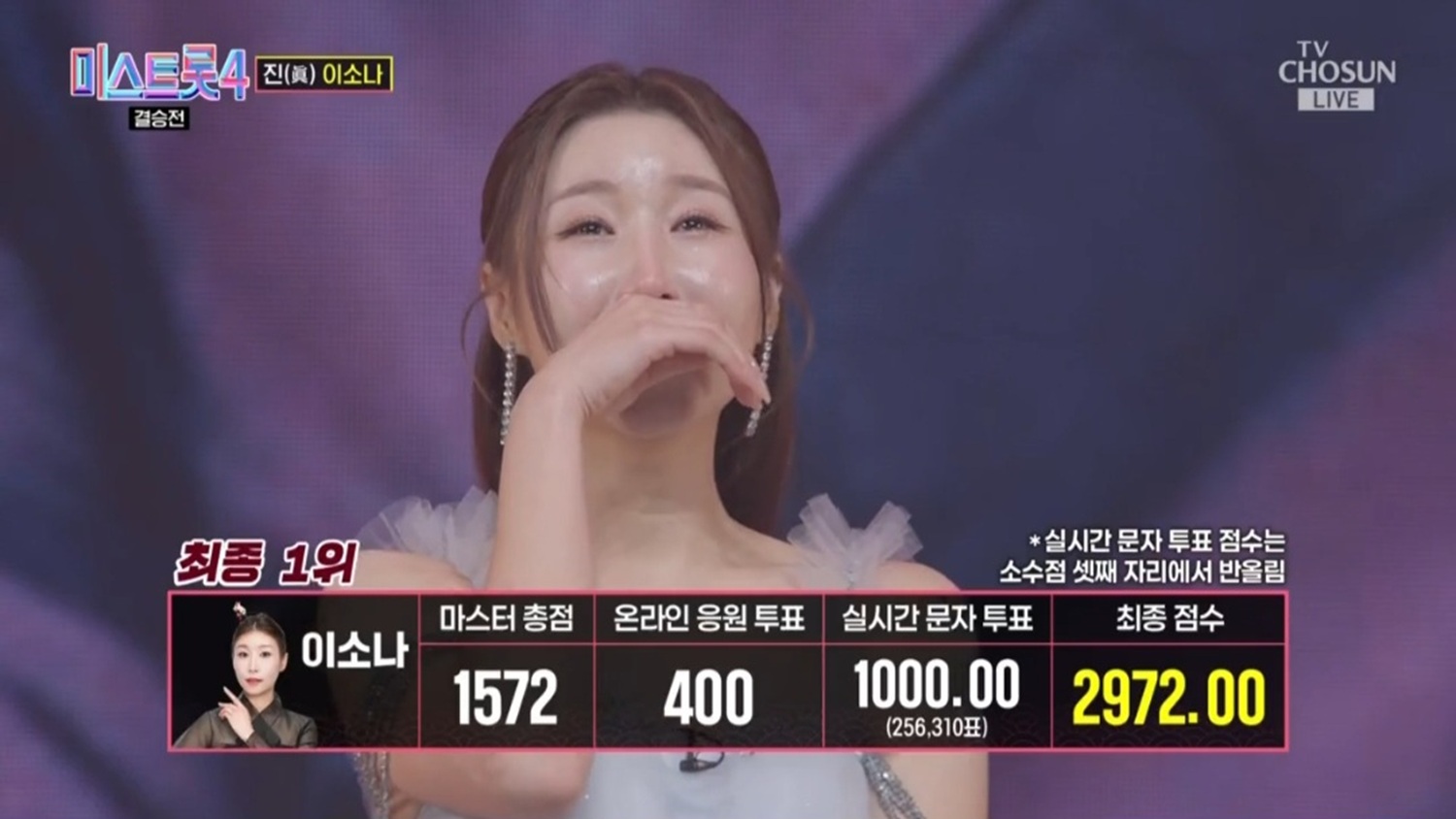 결승 무대에서 패티김의 ‘사랑은 생명의 꽃’을 선곡한 이소나는 부모님을 향한 헌사를 담은 진정성 있는 목소리로 마스터와 시청자 모두를 사로잡았다. 특히 마스터 총점에서도 홍성윤을 제치고 1위를 차지하며 실력을 증명한 뒤, 국민들의 손으로 직접 뽑는 문자 투표에서 쐐기를 박았다.