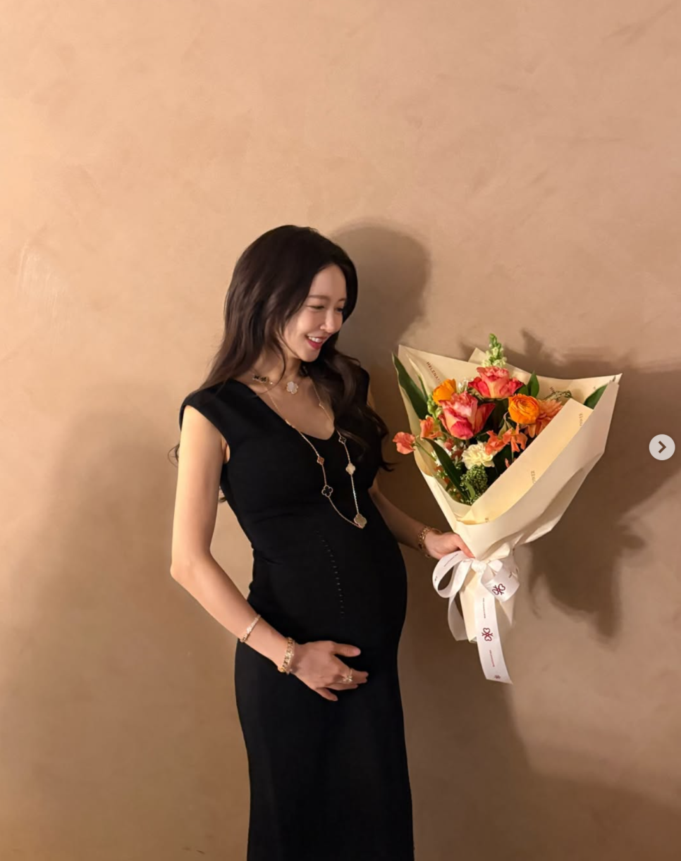 그는 최근 개인 계정을 통해 “D-80. 벌써 배가 만삭 배”라는 글과 함께 사진을 공개했어요. 사진 속 그는 만삭의 배를 잡은 채 꽃다발을 들고 환하게 웃고 있는 모습이었는데요.