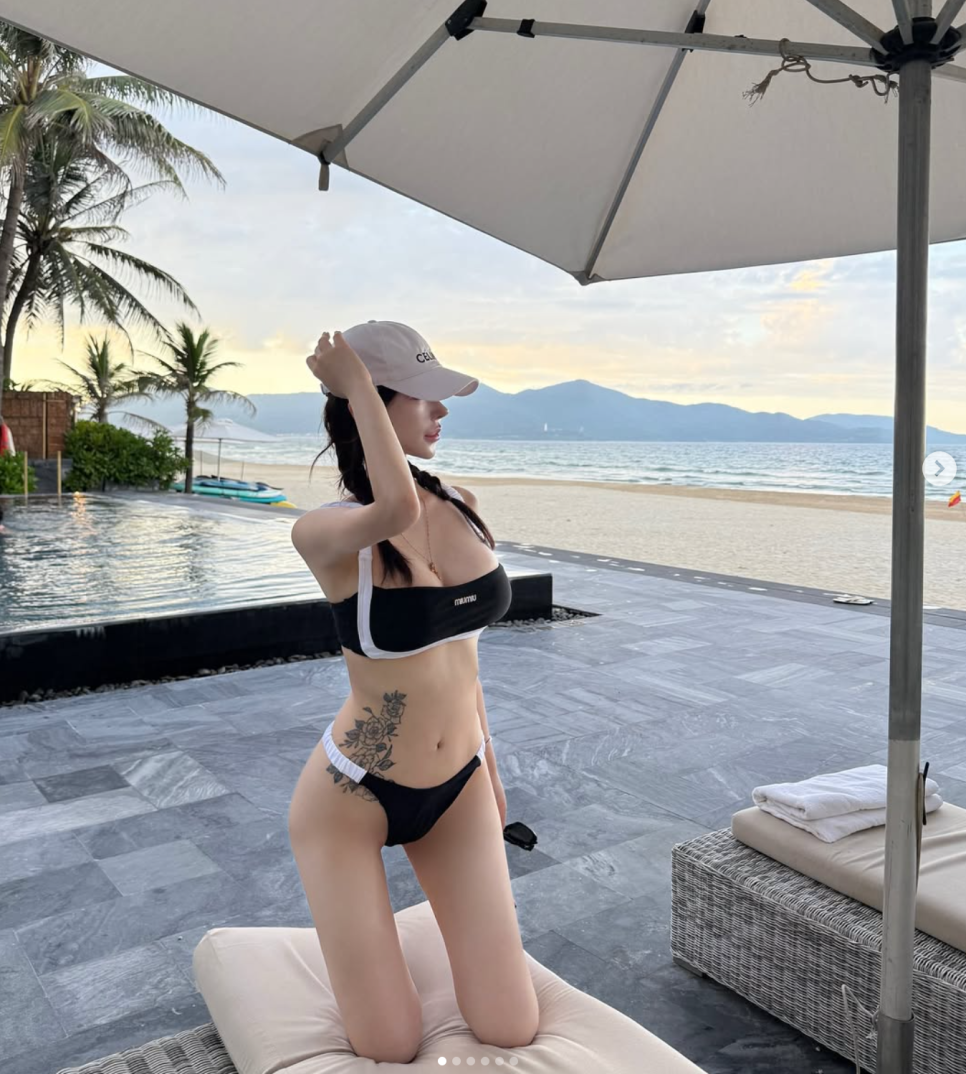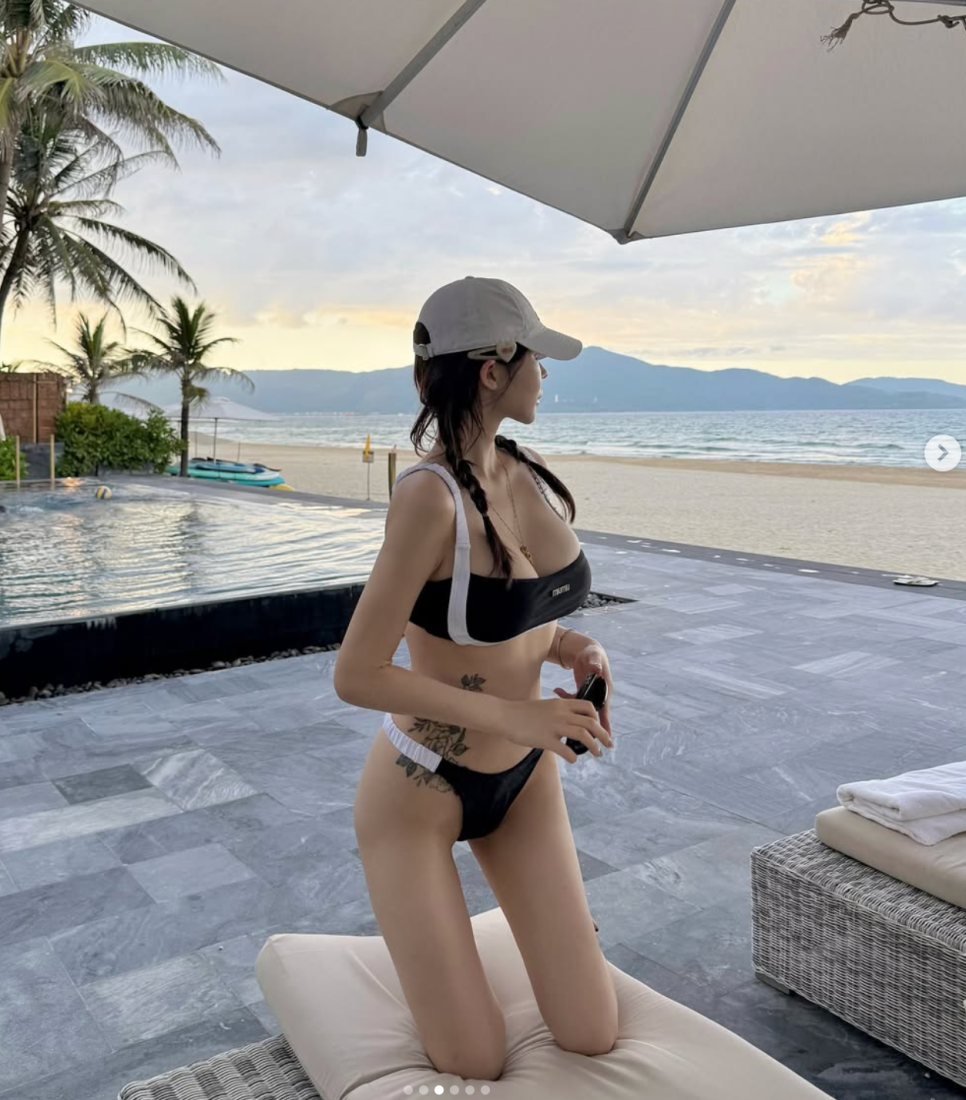 루프탑에서의 시크함과는 정반대로, 바닷가에서는 정말 자유롭고 힙한 느낌이에요. 블랙과 화이트의 대비가 선명한 로고 밴딩 비키니를 선택했는데, 이게 활동적이면서도 참 트렌디해 보이더라고요.