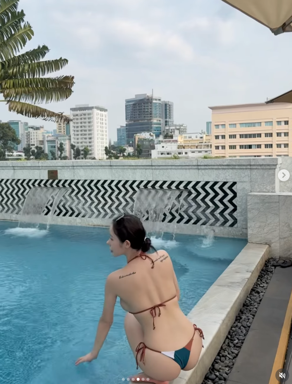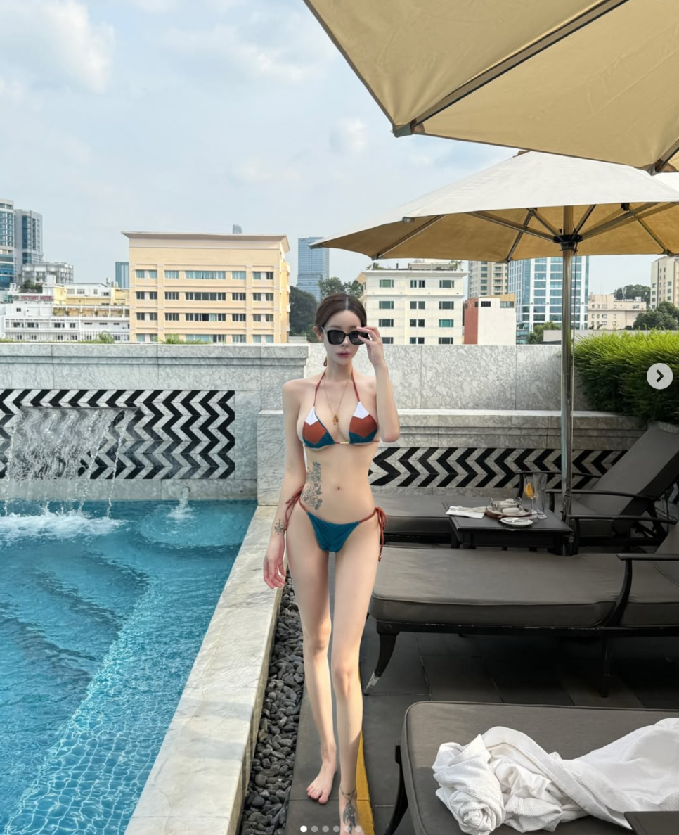 가장 먼저 제 눈을 사로잡은 건 루프탑 수영장에서 보여준 컬러 블로킹 비키니였어요. 딥그린과 테라코타 컬러가 섞인 디자인인데, 이게 피부 톤을 훨씬 고급스럽게 만들어주더라고요.