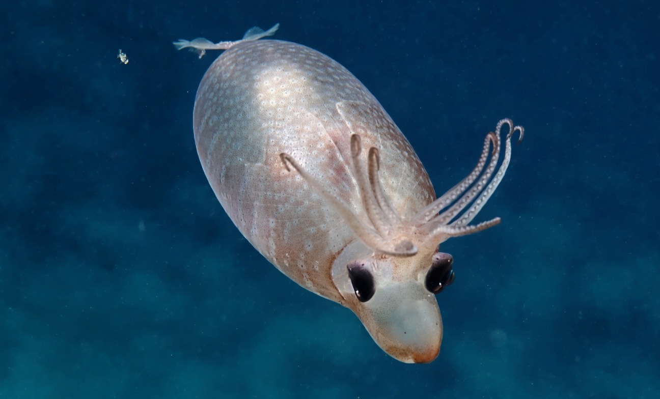 오징어라는데 생김새가 범상치 않다. 몸통이 통통하고 둥글며 눈 위에 곱슬곱슬한 촉수가 삐죽 솟아 있어 누가 봐도 영락없는 돼지 코를 연상시킨다. 영어권에서는 '밴드드 피글렛 스퀴드(Banded Piglet Squid)', 우리말로는 피글렛오징어로 불린다. 이름 그대로 작은 돼지를 닮은 오징어다. 수백 미터 심해에서 유유히 헤엄치는 이 작고 기묘한 생물이 세계 영화계의 주목을 한 몸에 받고 있다. 봉준호 감독이 첫 장편 애니메이션의 주인공으로 바로 이 오징어를 택했기 때문이다.
