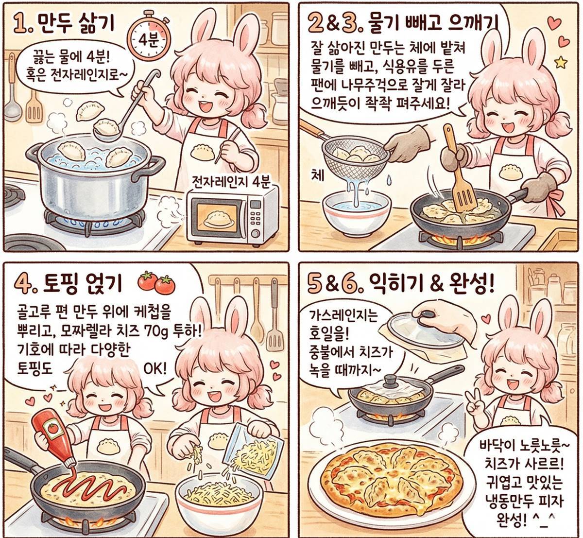 이 과정에서 만두피가 고르게 펼쳐지며 피자 도우 역할을 하게 된다. 여기에 치즈를 올리고 종이 호일을 덮은 뒤 중불에서 치즈가 녹을 때까지 가열하면 완성이다. 가스레인지를 사용할 경우에는 종이 호일 대신 은박지를 쓰는 것이 좋다. 치즈는 취향에 따라 체다 치즈를 섞어 풍미를 더할 수 있고, 베이컨·파프리카·양파 등 냉장고에 남은 재료를 토핑으로 활용하면 맛을 더욱 다채롭게 낼 수 있다.