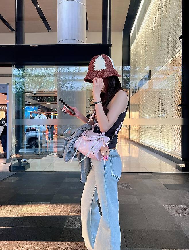 한 손에 든 핑크 컬러의 크로스바디 백은 블랙 탱크톱과 대비되어 선명한 컬러 포인트를 주며 전체적인 룩에 생기를 불어넣었습니다.