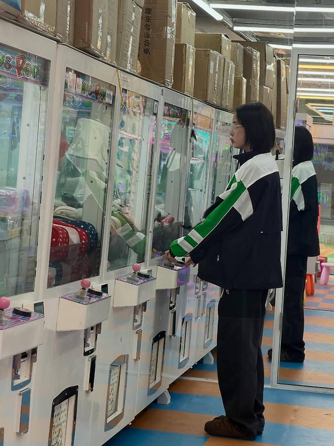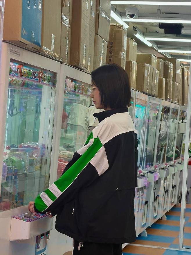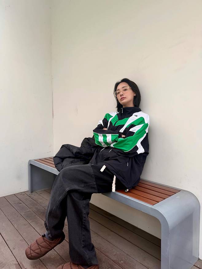 그녀가 선택한 메인 아이템은 블랙, 화이트, 그리고 비비드한 그린 컬러가 강렬하게 배색된 오버사이즈 트랙 재킷입니다.