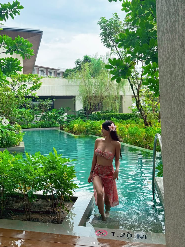 이번에는 따뜻한 느낌의 코랄 핑크 컬러 비키니를 선택했어요. 탑은 어깨 라인을 시원하게 드러내 여성스러움을 강조해주고, 같은 톤의 랩 스커트를 매치해 로맨틱한 실루엣을 완성했죠.