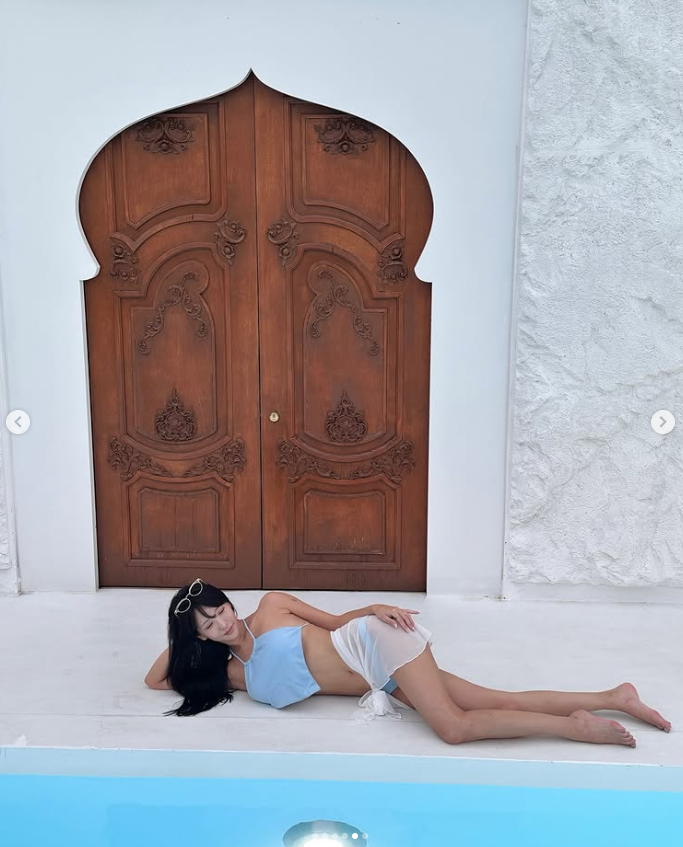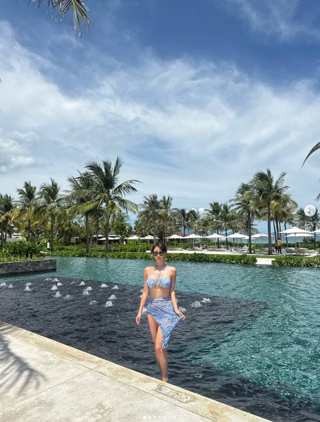 첫 번째 룩은 탁 트인 인피니티 풀에서 선보인 시원한 블루 패턴 비키니 스타일이에요. 보기만 해도 청량감이 느껴지죠?
