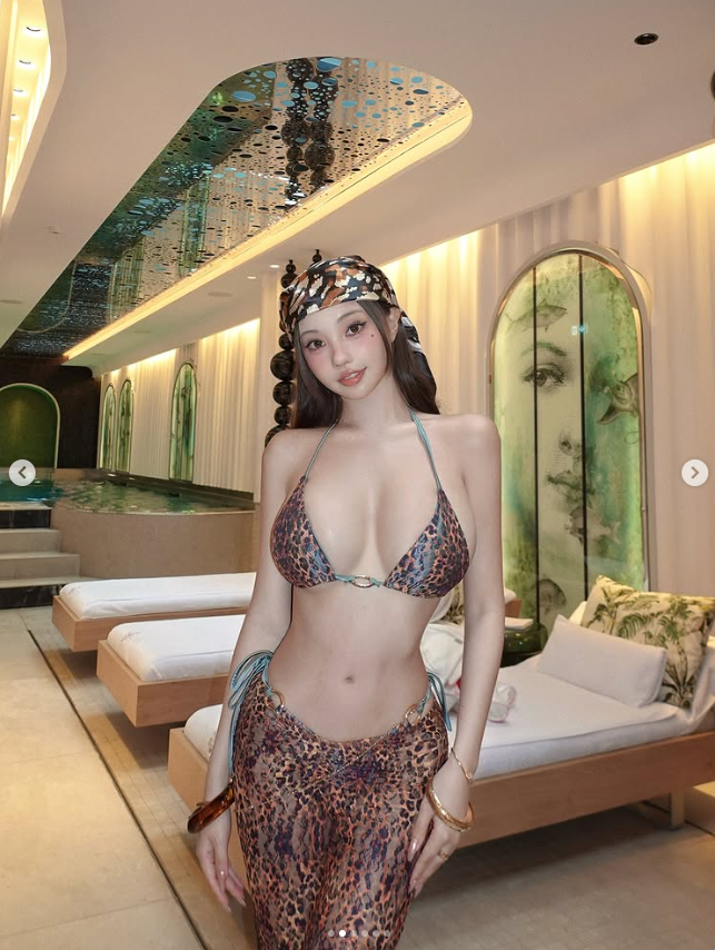이국적인 공간에서 린의 레오파드 패턴 비키니 스타일링은 단연 돋보였어요.