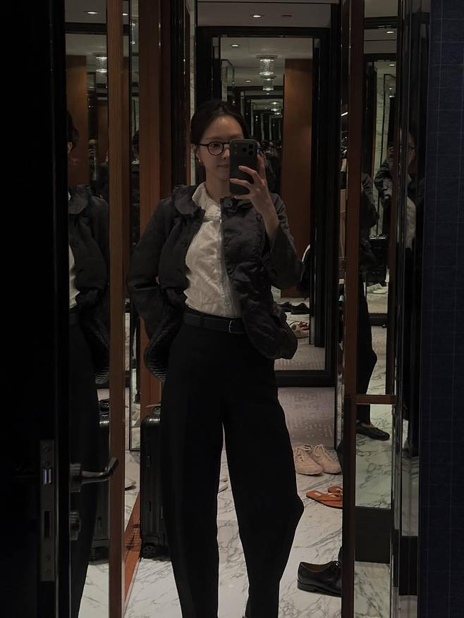배우 손나은은 거울 셀카를 통해 현대적이면서도 지적인 매력이 돋보이는 '긱시크(Geek Chic)' 스타일링을 완벽하게 선보였습니다.