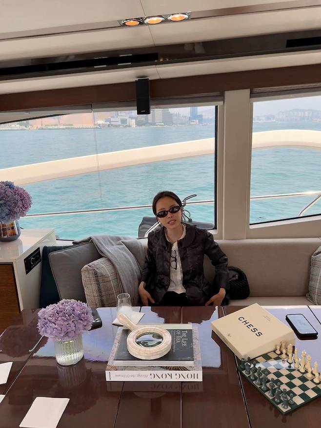 여기에 차분하게 묶은 헤어스타일과 거울을 응시하는 무심한 듯 시크한 표정은 화려한 장식 없이도 고감도 비주얼을 완성합니다.
