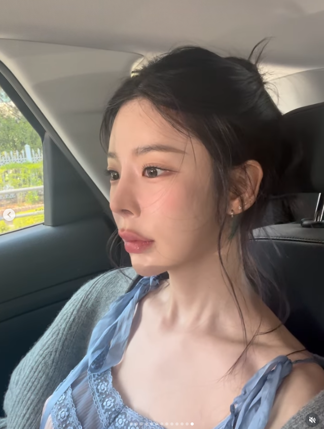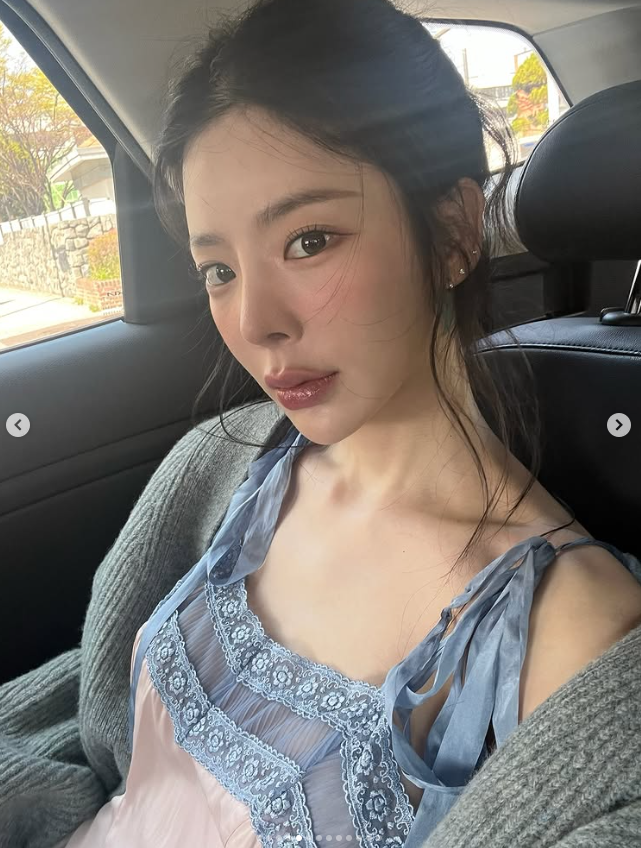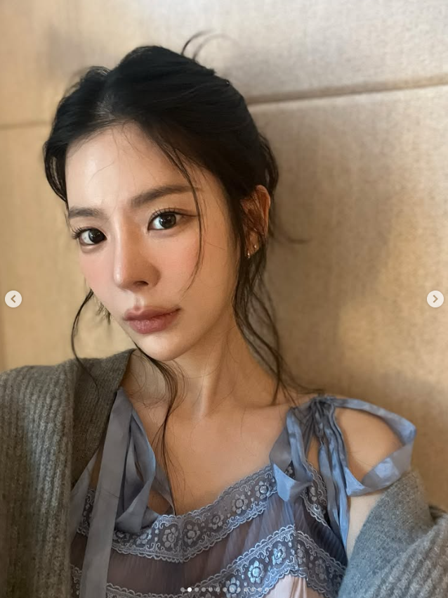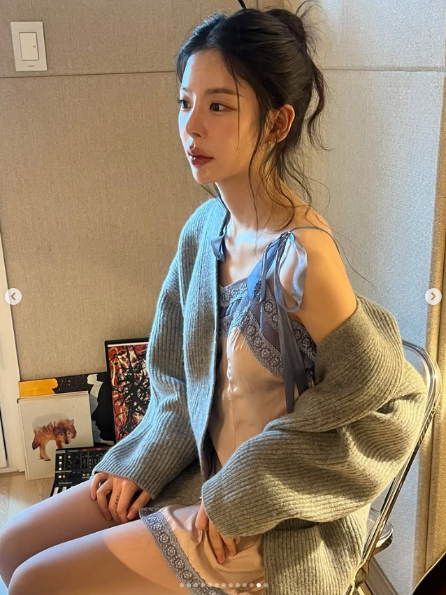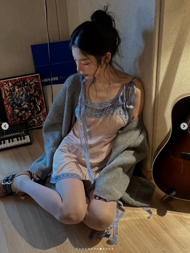 최근 장재인 씨는 자신의 SNS를 통해 작업실로 보이는 공간에서 촬영한 여러 장의 사진을 공개했어요. 연한 핑크와 블루 톤의 레이스 장식이 돋보이는 슬립 의상을 입고 자유로운 포즈를 취하고 있는 모습인데요.