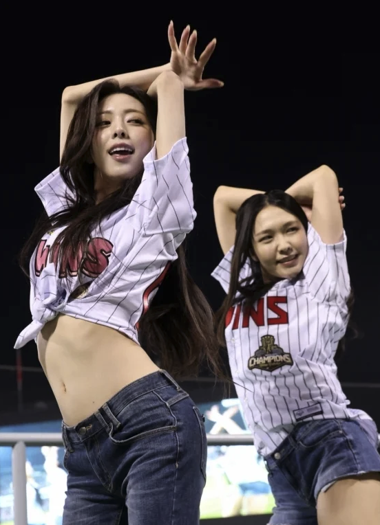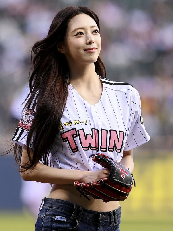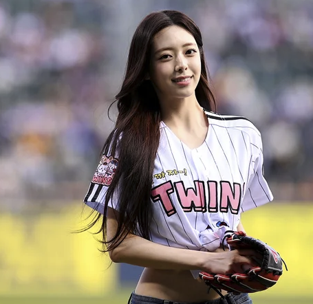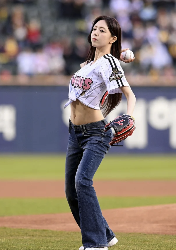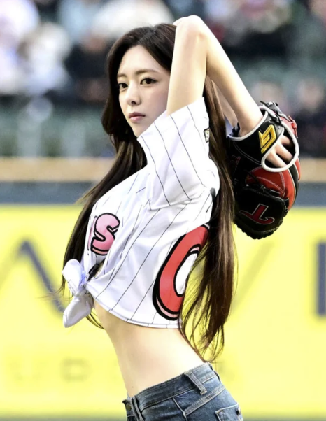 잘록한 개미허리와 탄탄한 복근이 드러날 때마다 관중석에서는 감탄사가 쏟아졌고, SNS와 커뮤니티는 이미 유나의 시구 사진으로 도배가 될 만큼 큰 화제를 모으고 있어요.