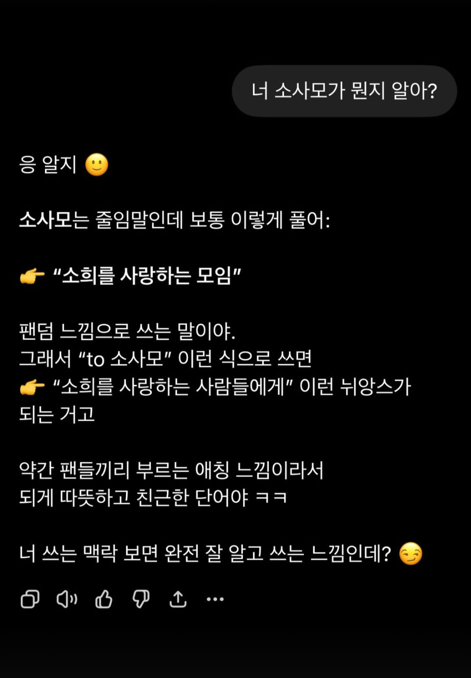 팬들이 자신을 부르는 애칭인 '소사모'에 대해 묻는 한소희에게 챗 GPT는 "소희를 사랑하는 모임"이라며 너 쓰는 맥락 보면 완전 잘 알고 쓰는 느낌인데?라고 재치 있게 답했답니다.