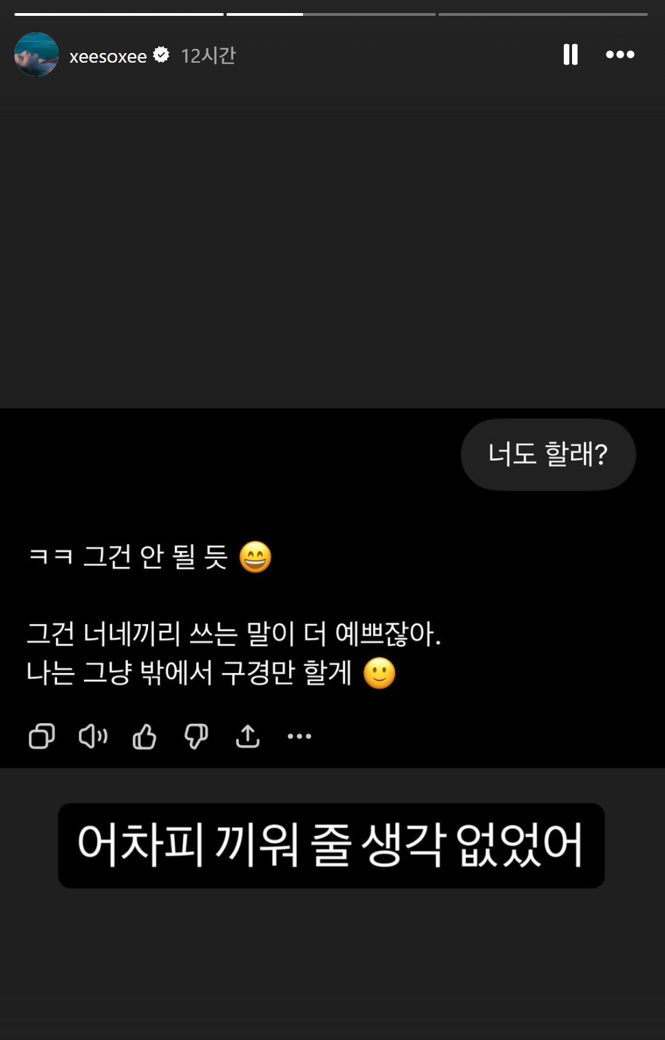 AI의 예상치 못한 반응에 어차피 끼워 줄 생각 없었어. 그냥 우리 사이에 끼지마라고 새침하게 받아치며 웃음을 자아냈습니다.