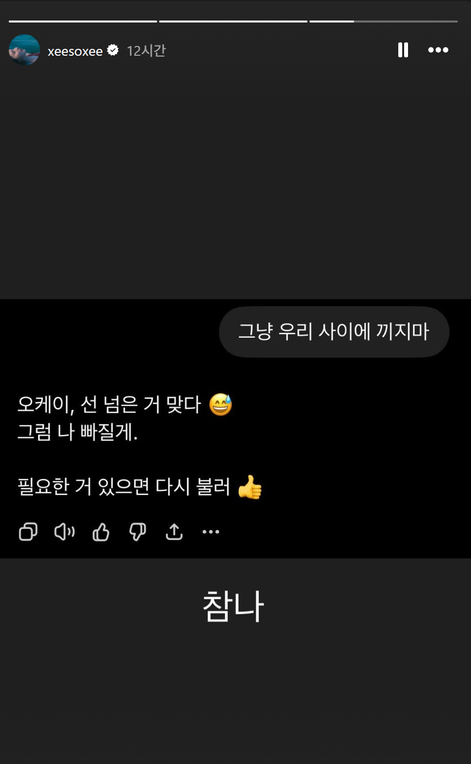 AI 역시 "선 넘은 거 맞다. 그럼 나 빠질게. 필요한 거 있으면 다시 불러"라고 쿨하게 답하며 대화를 마무리했어요.