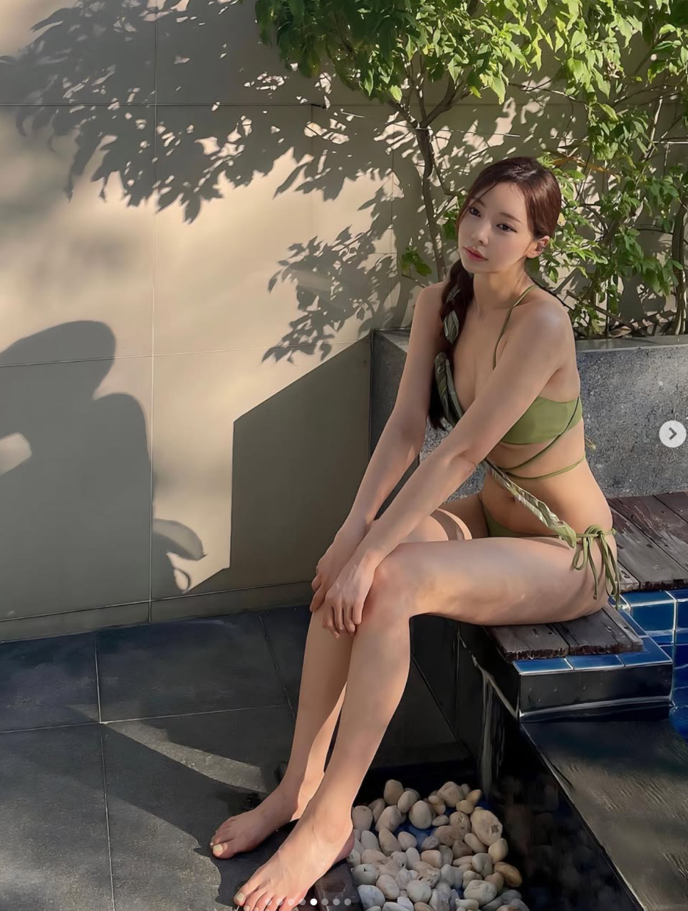 첫 번째 룩은 차분하면서도 고급스러운 올리브 그린 비키니예요. 단순한 수영복이 아니라, 세련된 '올드 머니' 감성을 물씬 풍기죠.