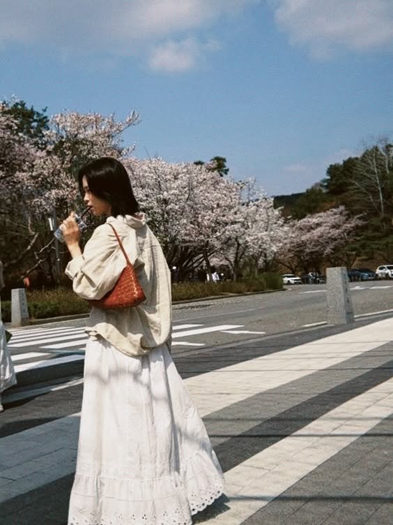 또 다른 사진에서는 흰색 긴 치마를 입고 벚꽃길을 걷는 모습도 공개했다. 도로와 차량이 보이는 공원 배경 속에서 자연스러운 발걸음이 눈길을 끌었다. 셀카 사진에서는 눈을 감고 미소 짓는 부드러운 표정으로 따뜻한 봄 햇살을 만끽하는 듯한 모습도 담겼다.