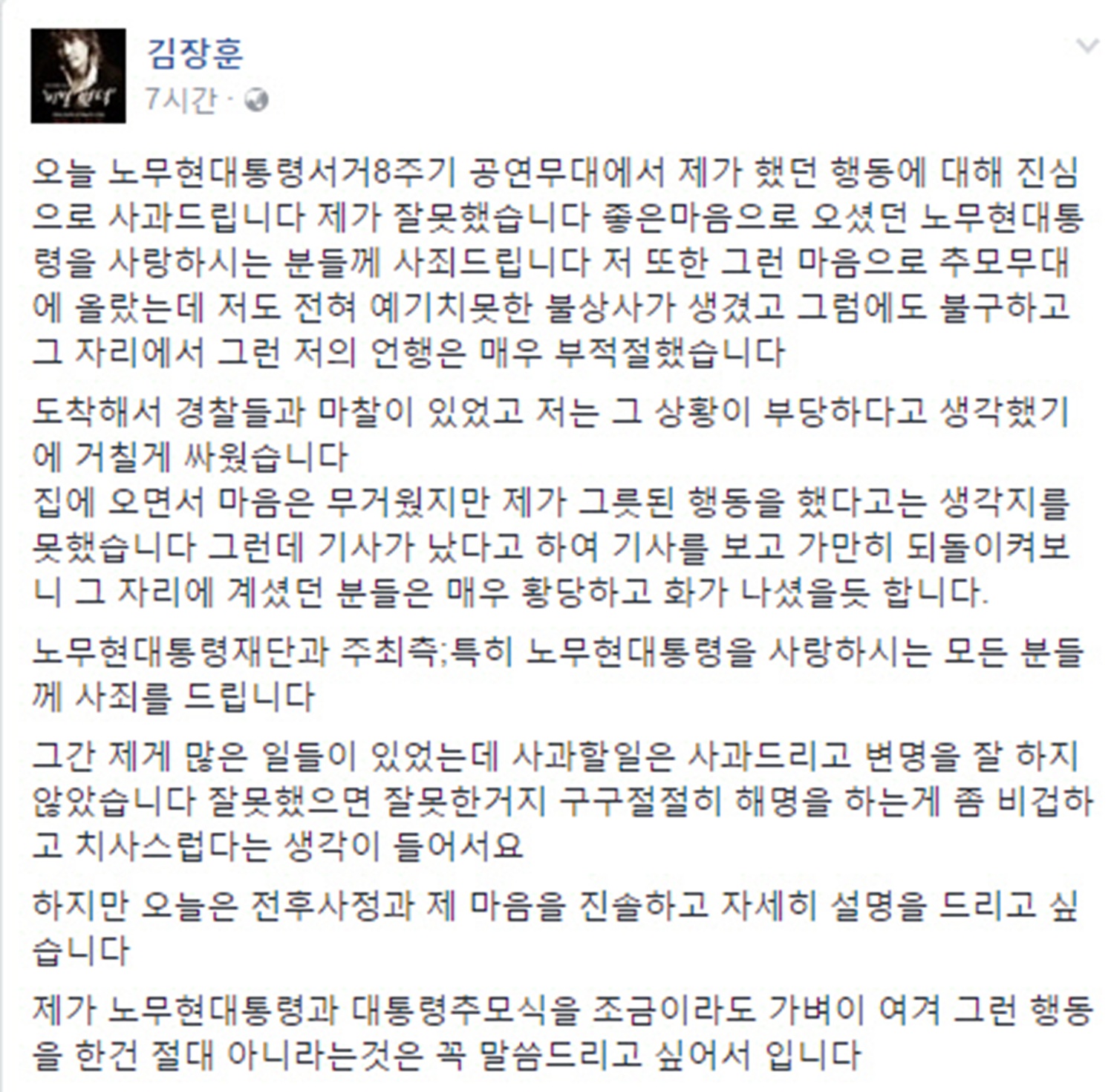 김장훈은 ‘원더풀 라이프’를 통해 “오랫동안 그리워한 분의 추모 공연을 제가 망쳤다”며 “그 자리에 계셨던 분들과 노 전 대통령을 사랑하는 모든 분께 큰 죄를 지었다”고 거듭 고개를 숙였다.