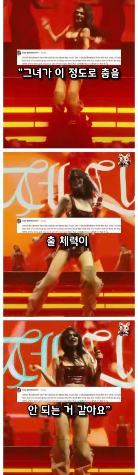 지금은 상상하기 힘들지만, 과거 제니는 해외 팬들에게 "춤추는 체력이 부족해 보인다"는 비판을 받은 적이 있습니다. 파워풀한 안무를 소화하기에 제니의 체력이 버거워 보인다며, 차라리 "퍼포먼스는 백댄서에게 맡기고 노래만 집중하는 게 어떻겠냐"는 다소 모욕적일 수도 있는 의견들이 나오기도 했습니다.