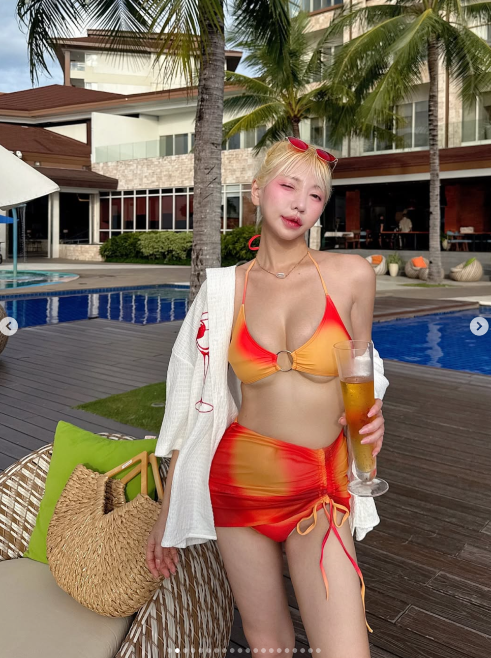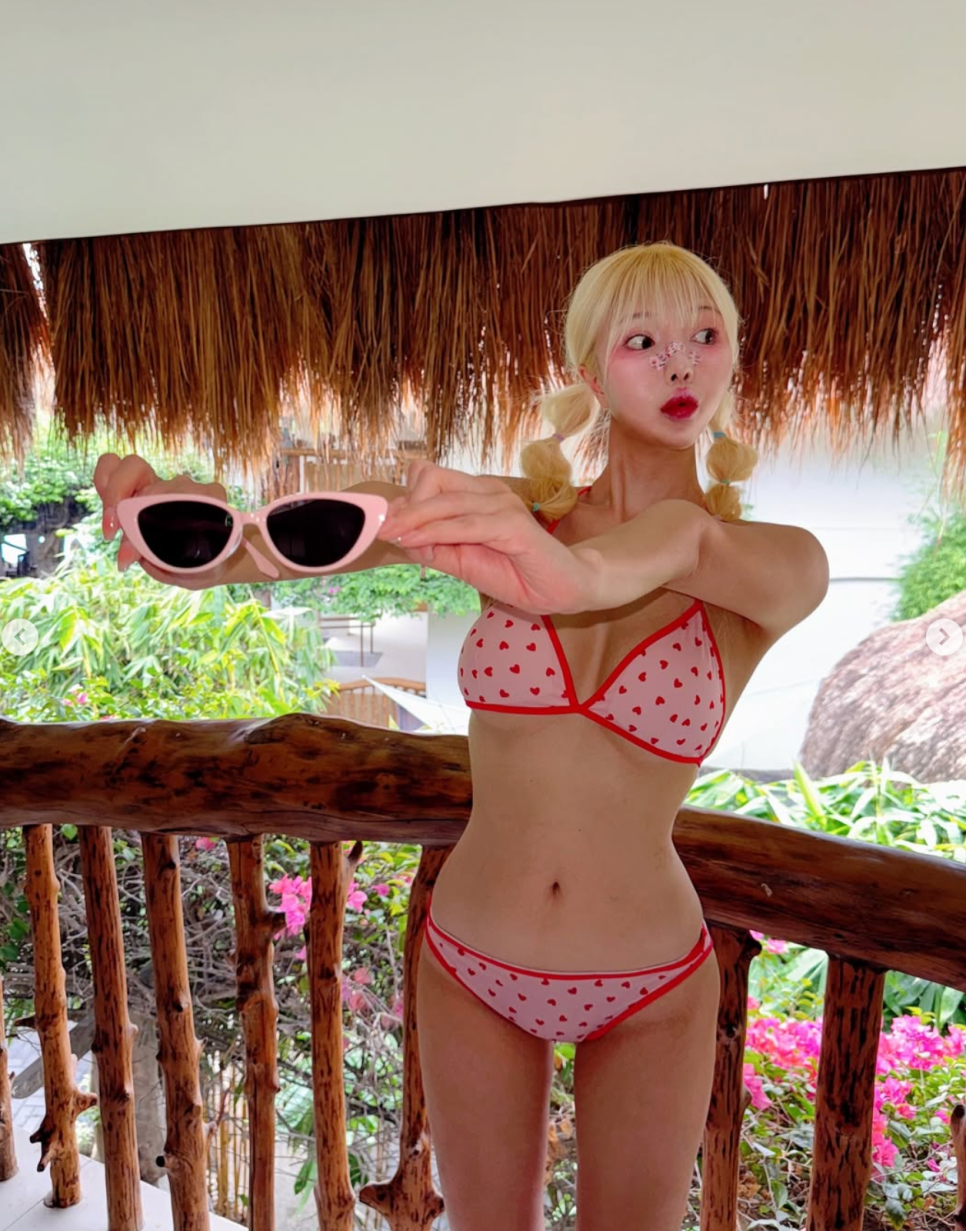 올여름, 뻔한 비키니 대신 효원님처럼 하트 패턴과 유니크한 액세서리로 나만의 '이스터 에그' 같은 매력을 뽐내보는 건 어떨까요?