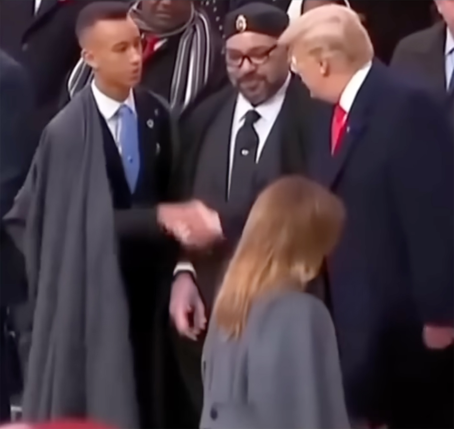 그런데 트럼프가 모로코의 왕세자 무레이 하산 앞에서는 무척 예의 바르게 악수를 건네는 모습이 포착되어 화제다. 평소의 고압적인 태도는 온데간데없고 정중한 자세로 왕세자와 손을 잡는 이례적인 장면이 전 세계의 시선을 끌었다. 이 장면에서 트럼프는 상대를 거칠게 끌어당기는 특유의 도발을 전혀 시도하지 않고 아주 조심스럽게 행동했다.