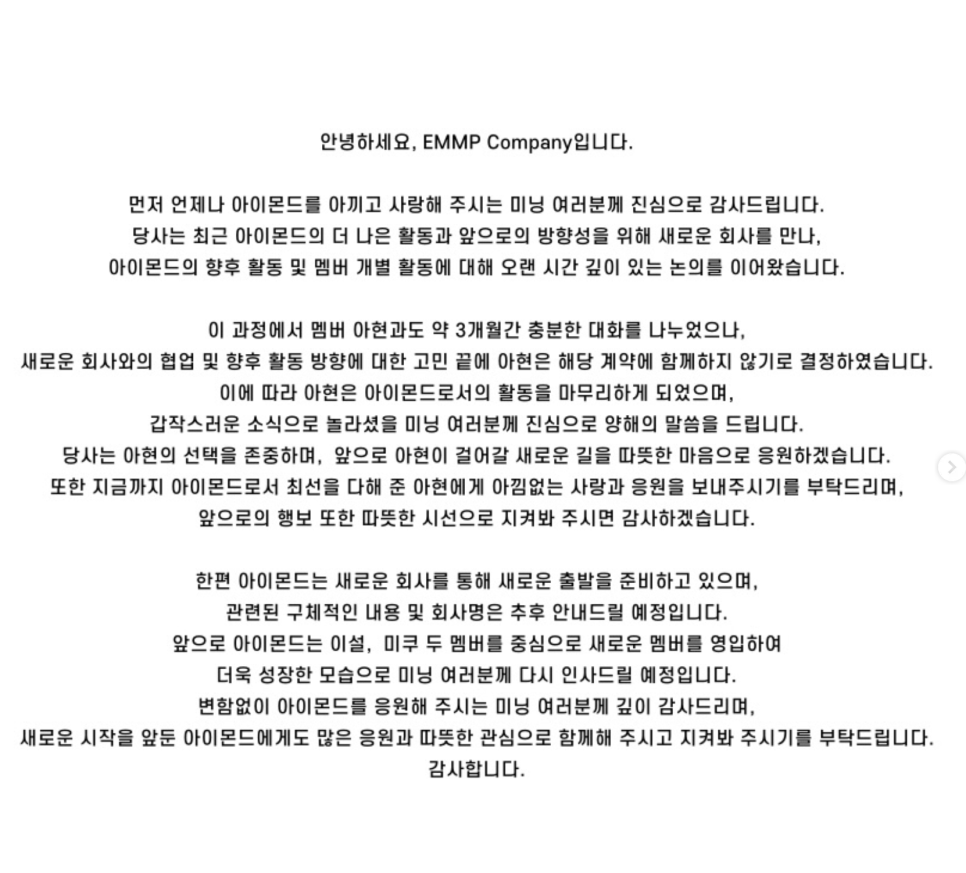 소속사 EMMP Company에서는 공식 입장을 통해 아현의 탈퇴 소식을 전하며 팬들에게 놀라움을 안겼어요.
