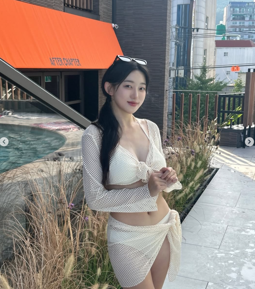 특히, 맑고 깨끗한 그녀의 이미지와 완벽하게 어우러지는 순백의 화이트 비키니는 청순함의 정석을 보여주는 듯했어요.