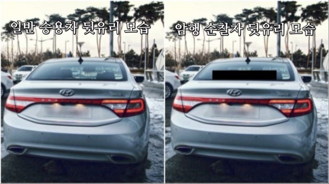 하지만 암행 순찰차에도 유일하게 단점이 존재하는데요. 경찰차 특성상 매우 짙은 썬팅 시공이 되어 있는 경우가 거의 없기 때문에 뒤에서 보면 암행 순찰차를 구분할 수도 있습니다. 시력이 1.0이상인 분들은 앞차에 뒷유리를 보았을때 운전자의 머리는 보이는데 뭔가 답답하게 사각형 물체가 가리고 있다면 암행 순찰차일 가능성이 높습니다.
