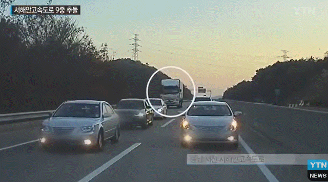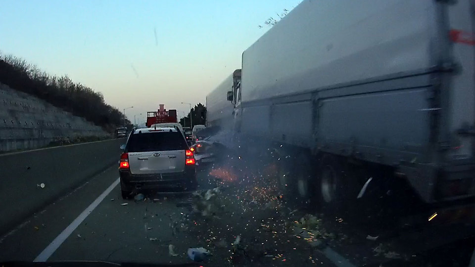 2017년 11월 21일 서해안고속도로 상행선 서산나들목 부근에서 발생한 연쇄 추돌사고입니다. 화물차가 가장먼저 서행하던 SM7 차량을 가격하고 앞에 있던 아우디 A6차량과 NF 쏘나타 차량 등을 추돌하면서 순식간에 아수라장이 되었습니다.