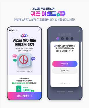 네이버는 14일부터 27일까지 '제22대 퀴즈로 알아보는 국회의원 선거' 이벤트를 진행하고, 추첨을 통해 2000명에게 네이버페이 5000포인트를 지급한다. 국회의원 선거와 관련된 4가지 퀴즈를 모두 풀면 자동으로 이벤트에 응모 가능하며, 본인 확인 가능 신분증, 투표 시간 등 선거와 관련된 주제가 문제로 주어진다.