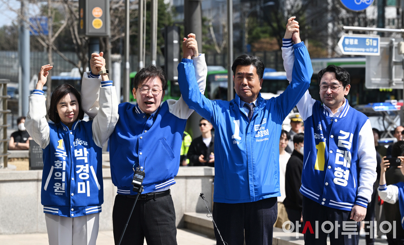 이재명 더불어민주당 상임공동선거대책위원장(왼쪽 두번째)이 24일 서울 강남구 수서역 인근을 방문해 더불어민주당 강남지역 후보들과 만세를 하고 있다. 왼쪽부터 박경미 강남구병 후보, 이 선대위원장, 강청희 강남구을 후보, 김태형 강남구갑 후보. [포토] 발언하는 이재명[포토] 송파 찾은 이재명광진구, 재건축·재개발 정비사업 아카데미 개최[포토] 대파 든 이재명[포토] 지지 호소하는 이재명