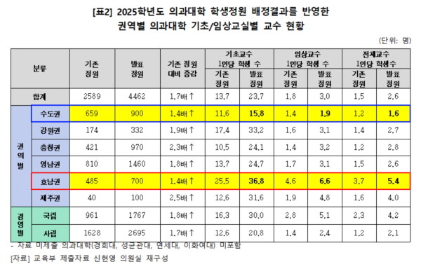 권역별로 살펴보면, 호남권 의과대학의 전체 교수 1인당 학생 수는 5.4명으로 수도권 의과대학의 1.6명에 비해 3배 이상의 격차가 벌어지는 것으로 나타났다.