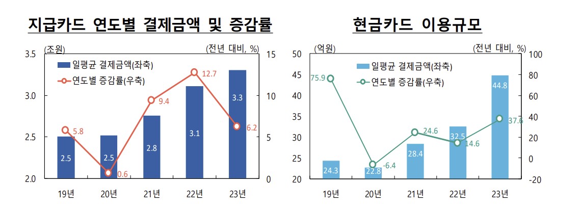 한국은행이 25일 발표한 ‘2023년중 국내 지급결제동향’에 따르면 지난해 지급카드 일평균 이용규모는 3조3000억 원으로 전년(3조1000억 원) 대비 6.2% 증가했다. 전년도 증가율(12.7%)의 절반 수준에 그쳤다. 뿐만 아니라 2019년 5.8%에서 2020년 0.6%로 증가율이 낮아진 이후 2021년(9.4%), 2022년(12.7%)에 이어졌던 증가추세가 3년 만에 멈춘 것이다.