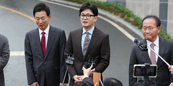 한동훈 국민의힘 총괄선거대책위원장이 26일 대구 달성군 박근혜 전 대통령 사저 앞에서 박 전 대통령 예방을 마친 후 기자들의 질문에 답하고 있다. <연합뉴스>