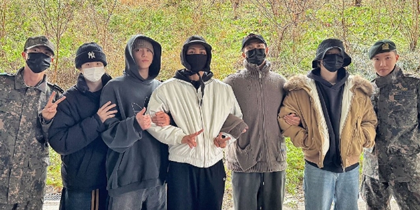 2023년 12월11일 방탄소년단의 RM(오른쪽 3번째)과 뷔(가운데)가 충청남도 논산 육군훈련소를 찾은 나머지 멤버들의 배웅을 받으며 현역으로 육군에 입대했다. 군복무로 단체 활동을 중단한다고 알렸던 2022년 6월 당시 소속사인 하이브 주가가 일시적으로 크게 하락했다. <연합뉴스>
