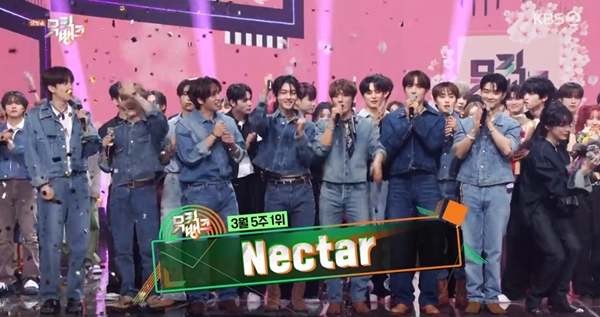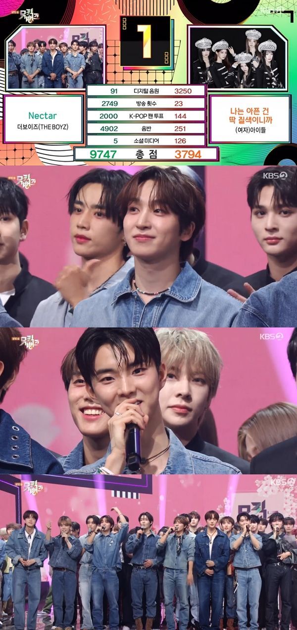 29일 방송된 KBS2 음악프로그램 '뮤직뱅크'에는 더보이즈의 'Nectar', (여자)아이들의 '나는 아픈 건 딱 질색이니까'가 1위 후보에 올랐다. 1위 트로피는 더보이즈가 차지했다. 더보이즈는 크게 기뻐하며 "더비(팬클럽명) 너무 감사하다"고 운을 뗐다.