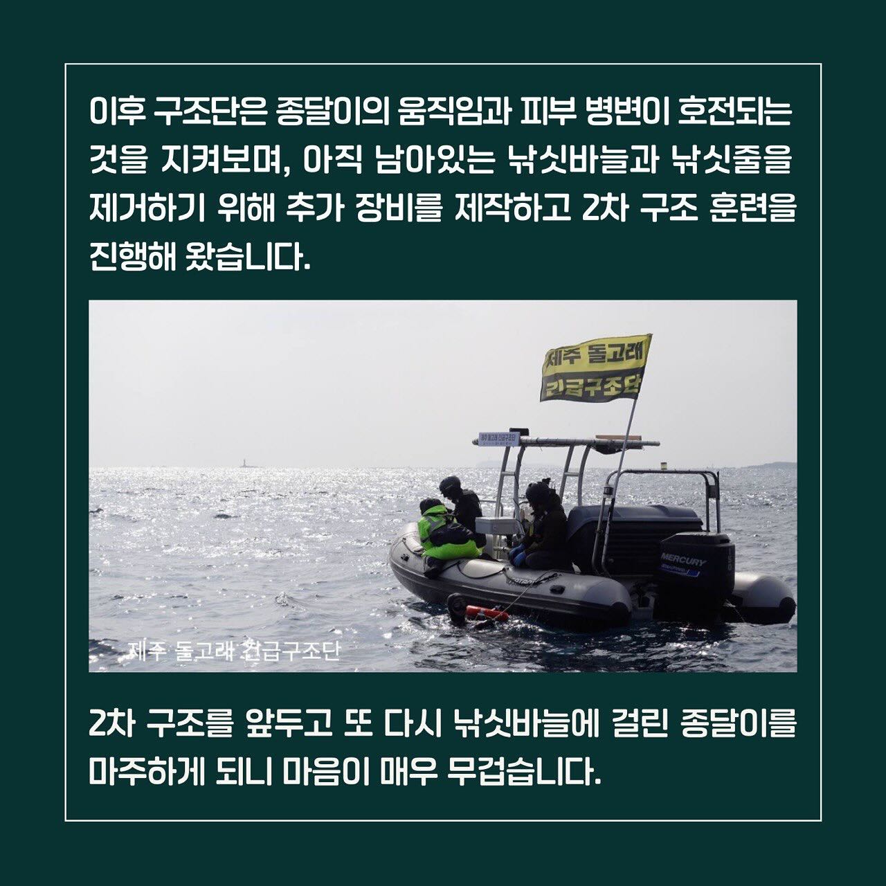 제주돌고래 긴급 구조단 측은 지난 7일 현장답사를 하고 이날 오전부터 대정읍 앞바다에서 구조작업을 펼치고 있다. 구조단은 몸에 걸린 폐어구 제거를 위해 대정읍 앞바다에서 종달이를 뜰채로 바다에서 건져낼 계획이다. 이날 구조 시도가 여의치 않으면 향후 다른 방법의 구조도 강구할 예정이다.