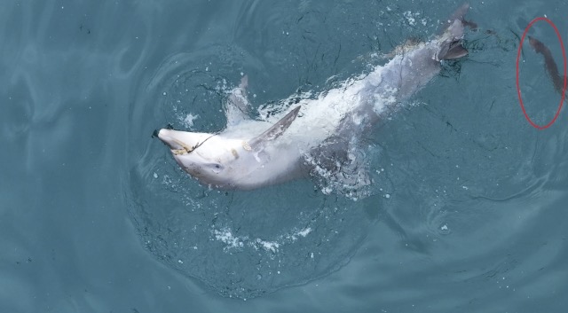 이에 핫핑크돌핀스(해양환경단체)와 해양다큐멘터리 감독 ‘돌핀맨’, 해양동물생태보전연구소(MARC)로 구성된 제주 돌고래 긴급구조단은 지난 1월 29일 배를 타고 나가 꼬리지느러미 쪽에 걸린 낚싯줄 일부를 절단하는 1차 응급처치를 했다.