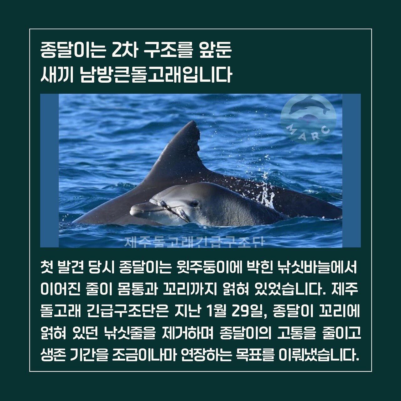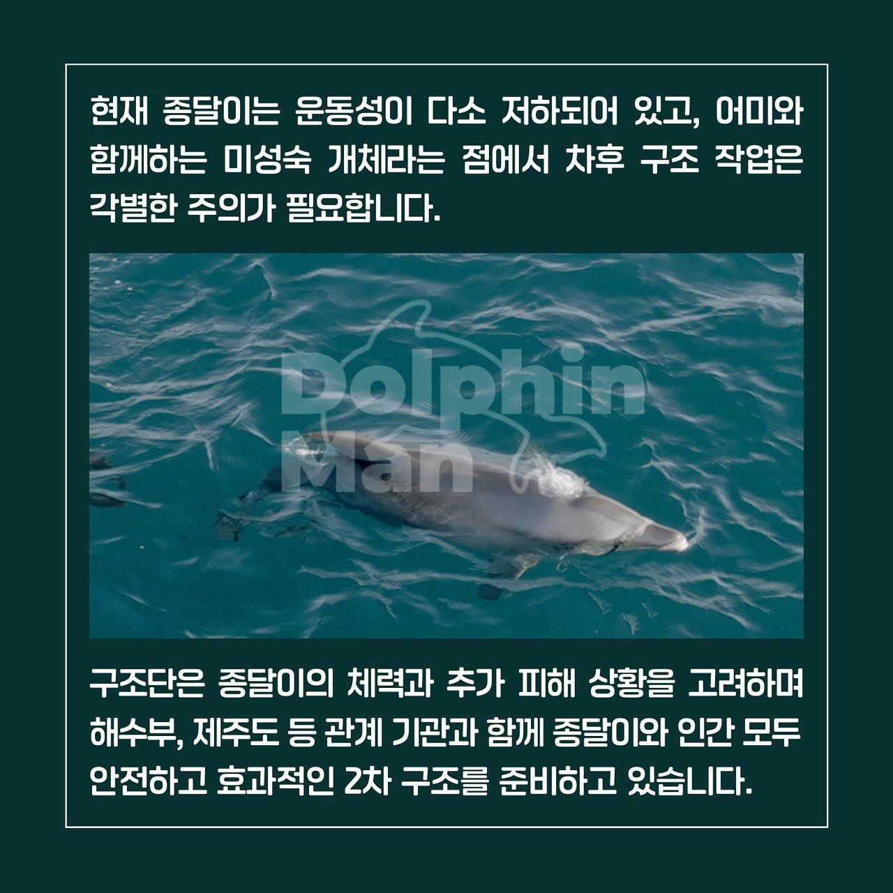 김 교수는 종달이 구조를 위해 가두리를 사용한 포획 등 신중한 접근을 구조단에 요청했다. 그는 “새끼남방큰돌고래가 폐어구에 걸린 모습이 처음 포착됐을 당시만 해도 이미 체력이 저하된 상태였다”며 “자칫 뜰채로 구하다가 스트레스로 인한 쇼크사가 벌어질 수도 있다”고 말했다.