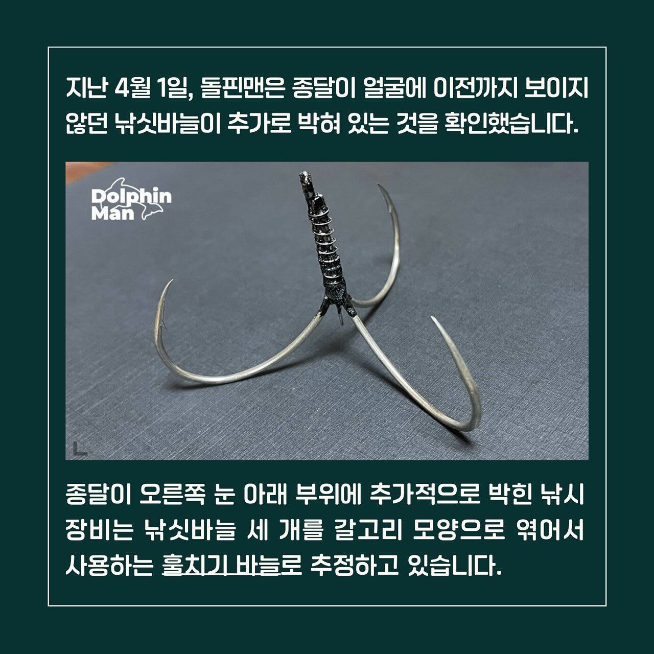 그러나 당시 꼬리지느러미에 제거하지 못한 30㎝가량의 낚싯줄이 남아 그곳에 해조류들이 또 달라붙고, 주둥이와 몸통에도 여전히 낚싯줄이 얽혀 있는 상태로 파악됐다.